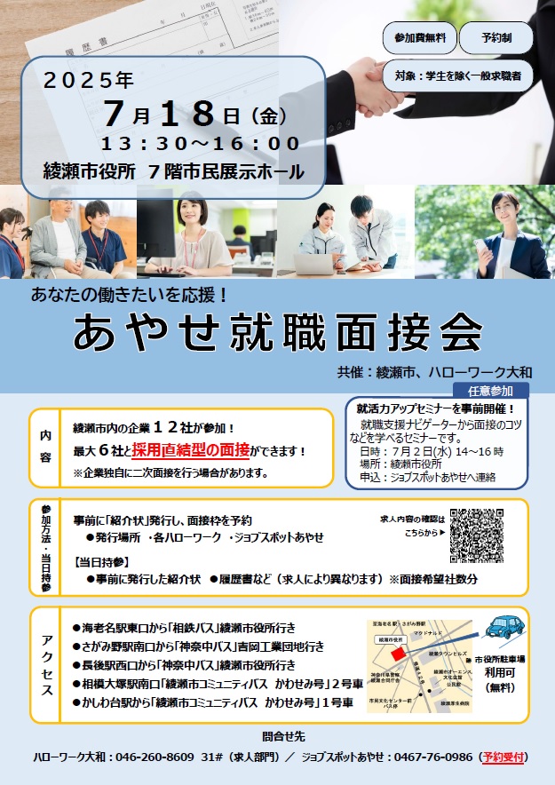 綾瀬市とハローワーク大和の共催による「あやせ就職面接会」を開催します。