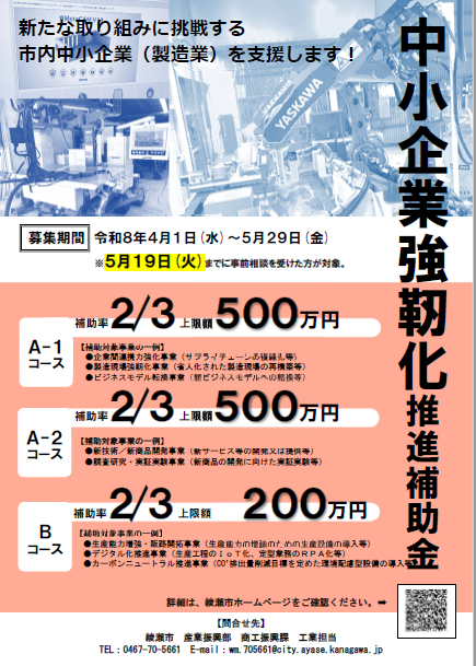 綾瀬市中小企業強靭化推進補助金は、更なる市内産業の活性化・高度化を図るため、市内中小企業者が取り組む、新たなビジネスモデルの構築、デジタル化の推進、生産性向上やカーボンニュートラルの推進のための設備導入などへの投資を支援するものです。