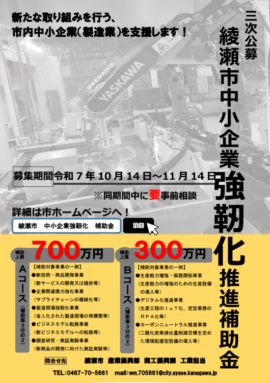 中小企業強靭化推進補助金 【三次公募:令和7年10月14日~同11月14日】
