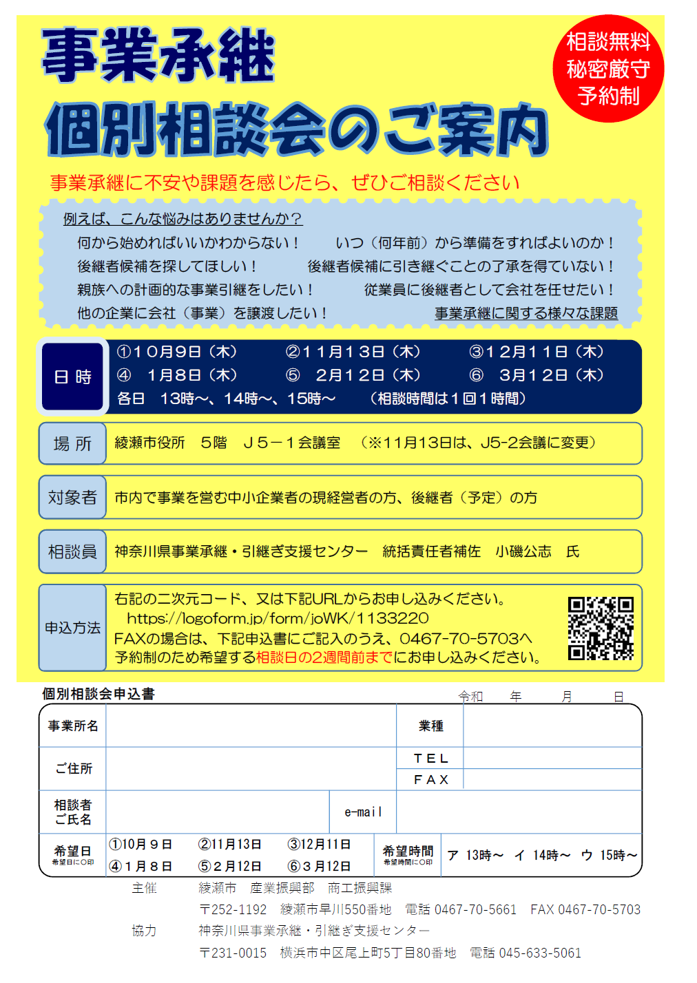 ●ファクスの場合は、添付ファイルの「事業承継個別相談会チラシの個別相談会申込書欄」をご記入のうえ、商工振興課のファクス番号 0467-70-5703 へ送信してください。