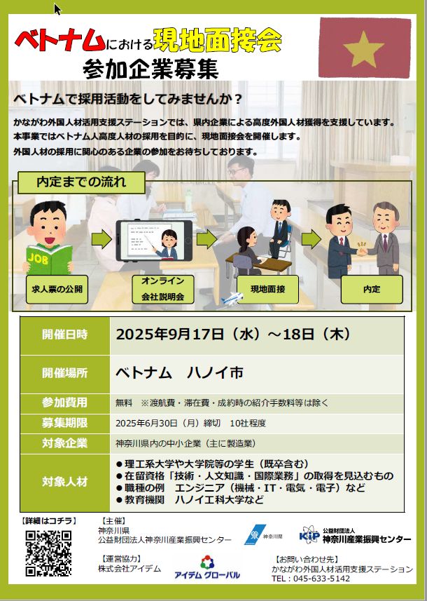 かながわ外国人材活用支援ステーション(KIP)では、ベトナム社会主義共和国において、高度外国人材の採用を目的とした現地面接会を開催します。